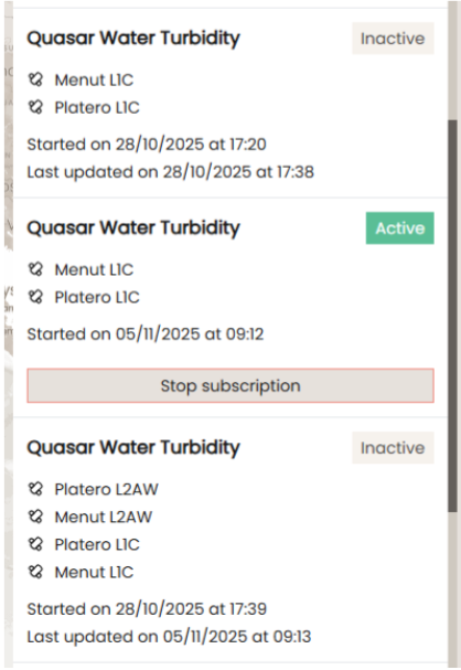 The User can now see which subscriptions are running on the selected Project, and can Stop the subscriptions that are no longer needed.