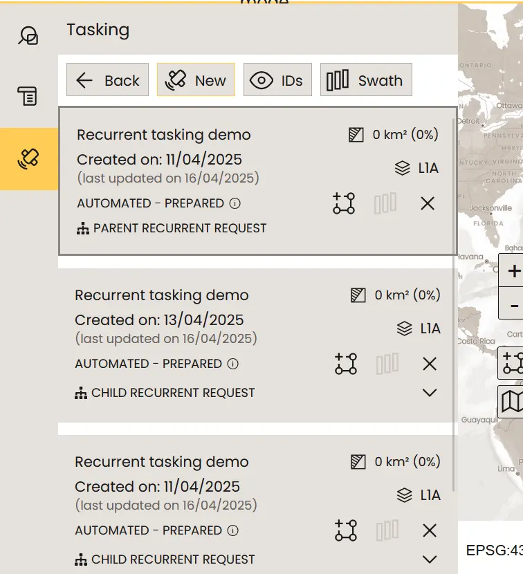 The tasking system will automatically create child tasking requests based on the parameters provided in the parent requests. Each child request will then continue as a normal automated tasking request, following the same tasking lifecycle. Child requests are created one week before they are due to start.