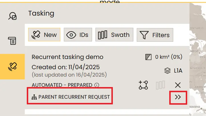 Recurrent tasking allows users to create a tasking request that will be repeated automatically at specified intervals. This feature is particularly useful for customers who require regular satellite imagery over a specific area of interest, such as for monitoring environmental changes, urban development, or agricultural practices.