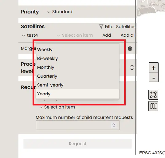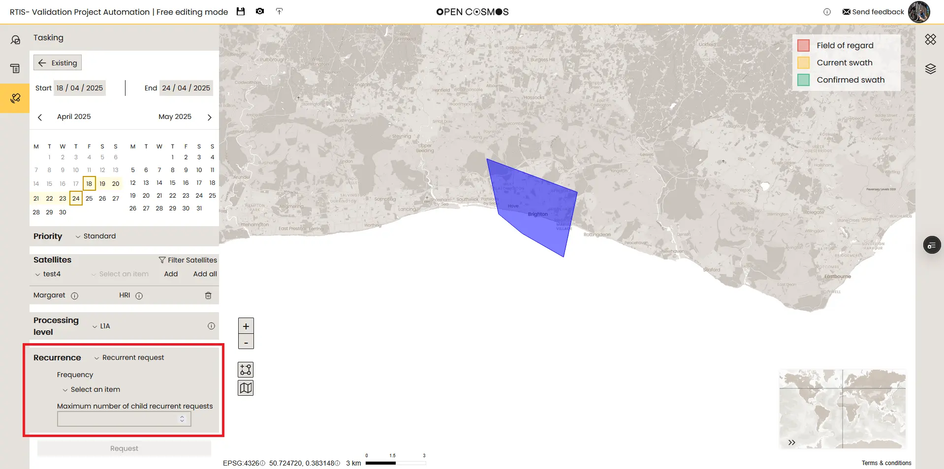 To start creating a recurring tasking request, first select the “Automatic” button after creating the area(s) of interest. Then set the desired acquisition date range, constraints and objectives as described in the Automated Tasking page. Upon reaching the "Recurrence" section, select "Recurrent request".