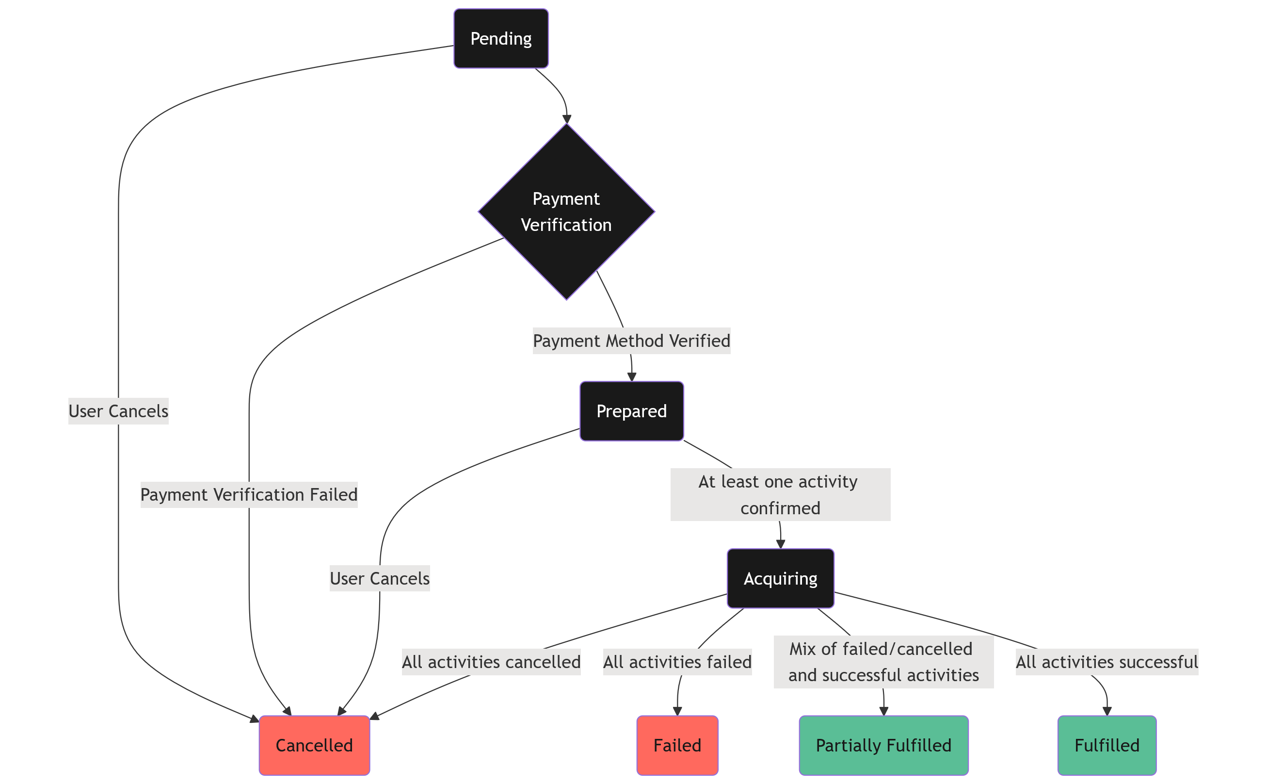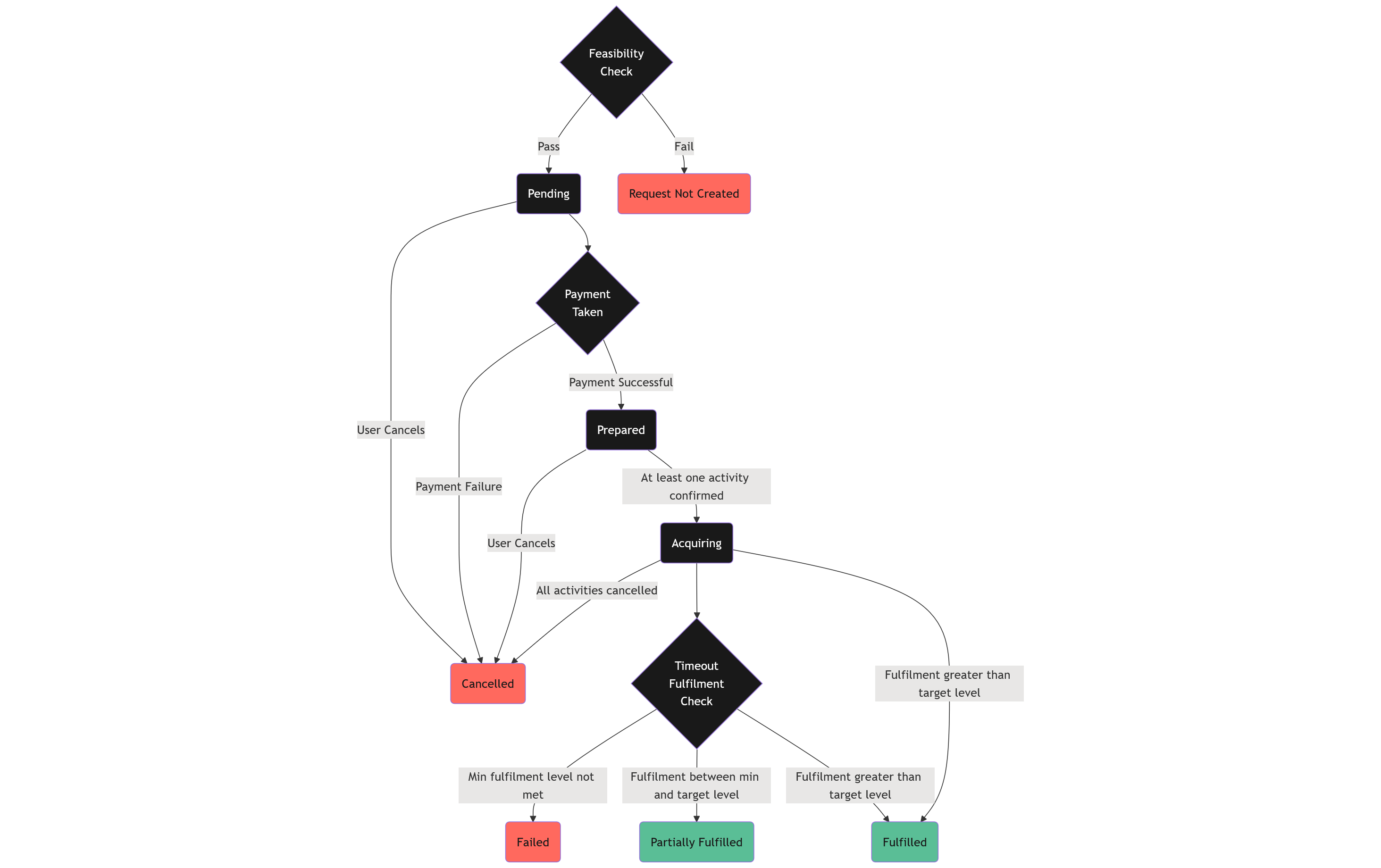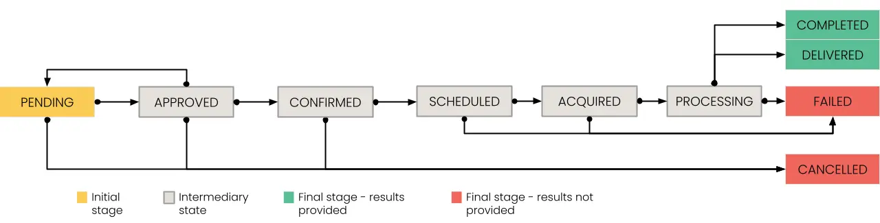 PENDING: A request that has been submitted but is not yet active. This typically happens when the request has passed the pre-creation feasibility checks, but the user has not completed the process to select a payment method.