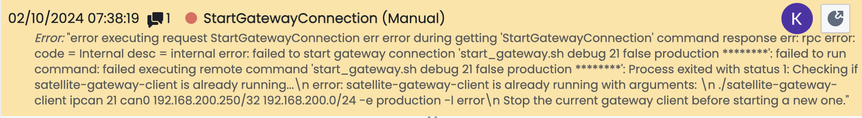 If you encounter an error like the one shown below, it means that the gateway connection has already started. You will need to stop the connection before starting it again.