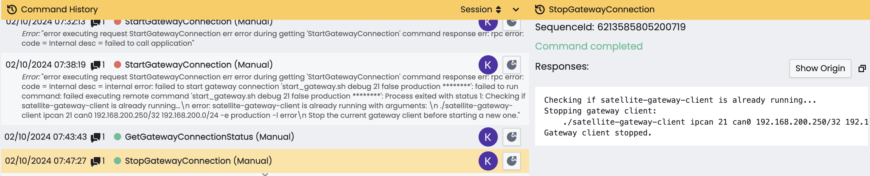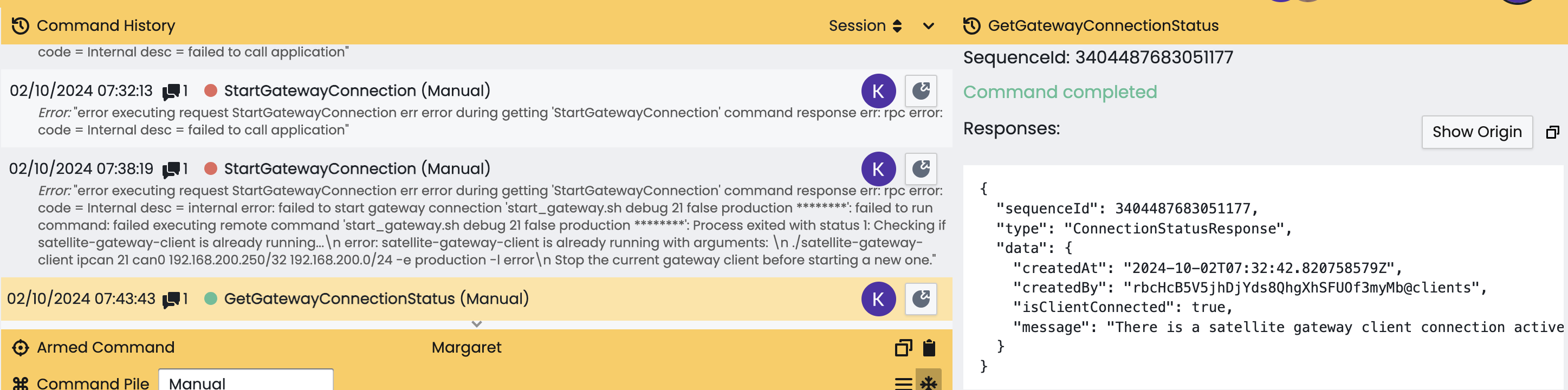 To manage the satellite gateway client connection, users can send commands to start or stop the connection from the mission RTI.
