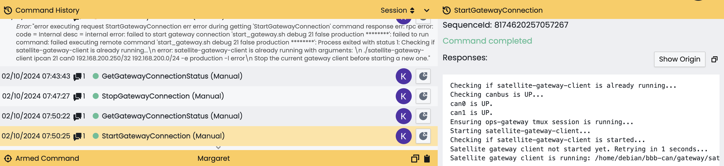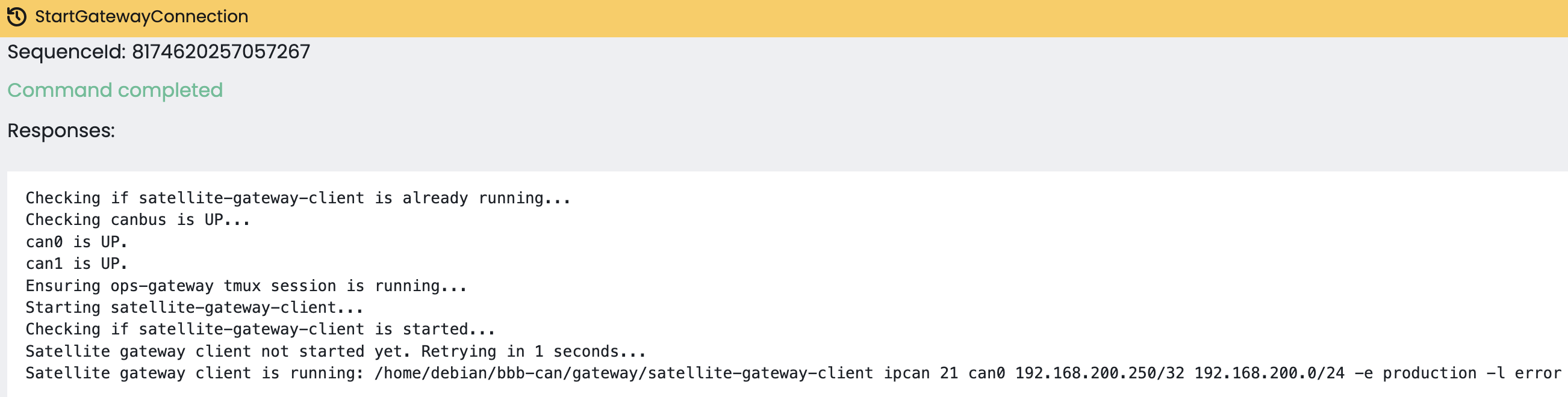 The screenshot below will show the response when the gateway connection is connected to the current mission.